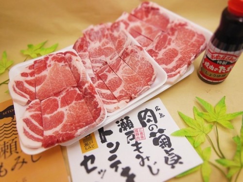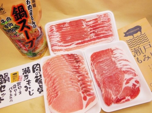 瀬戸もみじ豚の各種部位とおいしい鍋スープがセットになっております人気の商品です。
